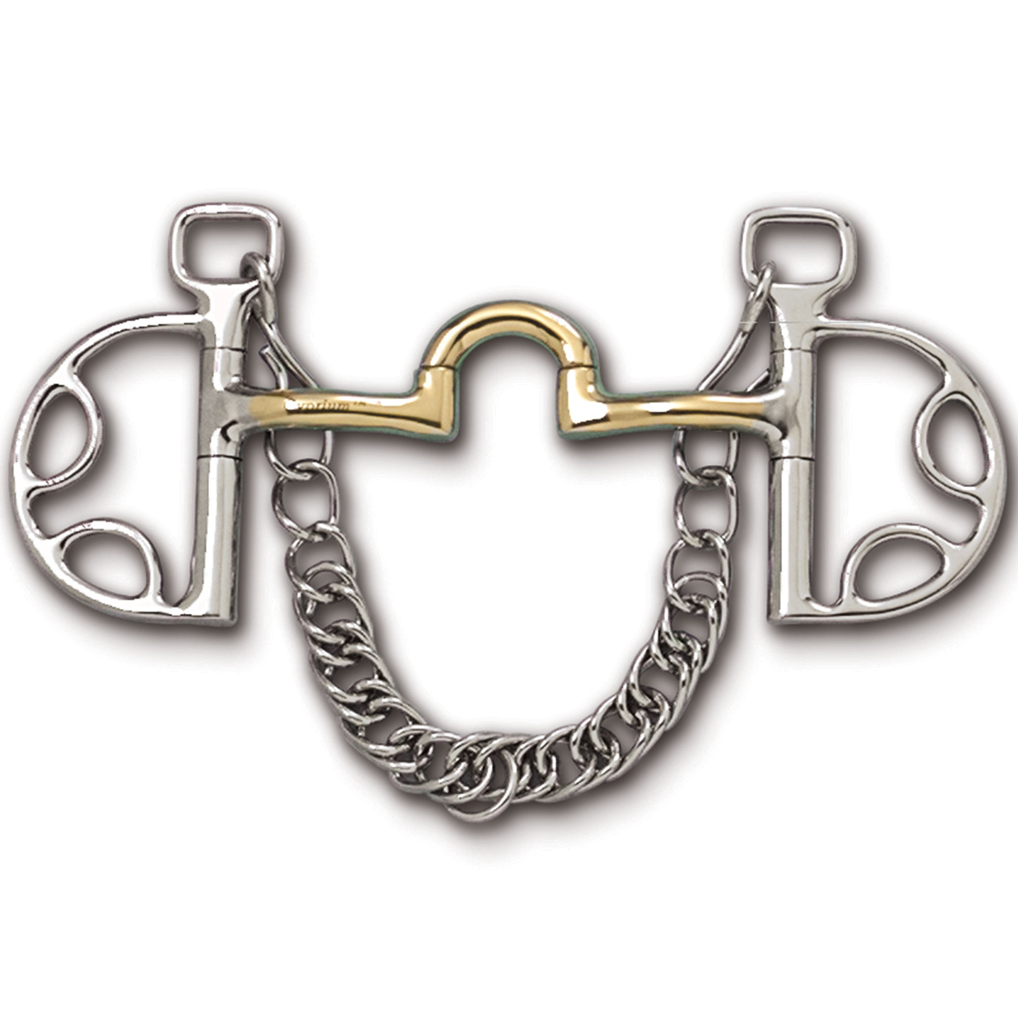 The MB 27LP is a Myler correctional mouthpiece, which is a ported mouthpiece that collapses onto the outer lip and bars and rotates onto the tongue. The port, although narrow, offers room for the horse’s tongue to pass under the bit. When the reins are engaged and the mouthpiece rotates onto the tongue, it applies two concentrated points of pressure on the tongue for quick control. Because this port is only 1 ¼" high, it will apply little to no palate pressure. Cyprium is a nickel-free copper alloy suitable for horses with a sensitivity to nickel.
