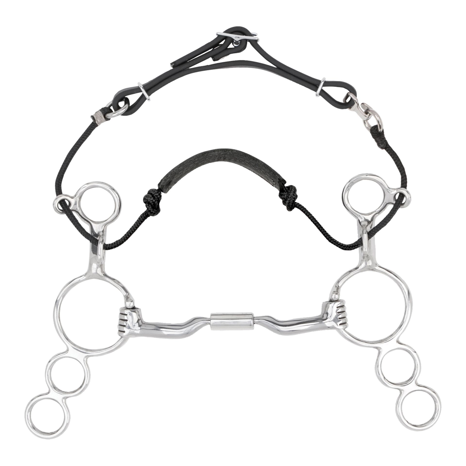 Notes: If you ride with your rein attached to the big ring, it will function only as a direct rein snaffle and not apply nose, chin, poll pressure as a combination bit.