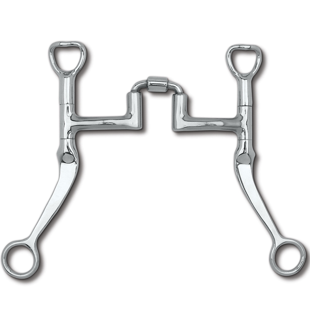 Notes: For more tongue relief, see the MB 41PB. For the same mouthpiece without Independent Side Movement, see the MB 27. For a non-correctional version offering more tongue relief, see the MB 43LP. The 7" Flat Shank is stainless steel and curved slightly back towards the horse, with a flat-top purchase and a rein ring. The mouthpiece has a fixed attachment. The Flat Shank has the patented Independent Swivel Cheek, where the purchase, mouthpiece, and shank all move independently of each other. The purchase is slightly angled away from the cheek to avoid rubbing. It has an indirect (curb) rein action designed to be used with a curb strap that attaches to the purchase. The flat shank uses the combination of the fixed cheek and fixed rein to apply pressure to the mouth, chin, and poll.